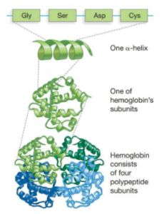 As mentioned, proteins are made up of a primary amino acid sequence, which forms localized folding patterns glued together through hydrogen bonding. The tertiary structure of proteins describes the three-dimensional shape and the quaternary structure is composed of multiple protein subunits that come together to form the fully functional protein complex (Figure 2).