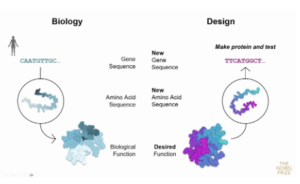 However, before establishing the IPD and winning the Nobel Prize, Dr. Baker was a junior faculty interested in designing proteins that don’t typically exist in nature. Proteins have evolved to perform highly diverse and specialized functions but as humans live longer and acquire different and new diseases, there is a need for rapid solutions to the growing list of biological problems. Initially, Dr. Baker and his colleagues at the time, sought to accomplish their goal of de novo protein design by identifying the function of a protein they wanted to make, essentially reversing the order of events in the central dogma.
